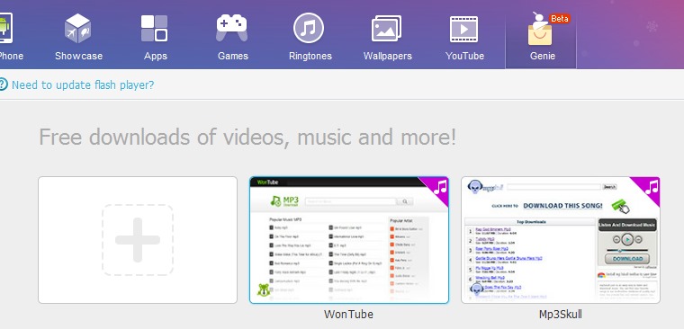 - Genie (beta): This option is in beta phase at present. This option allows to search & download music or video files. You can also suggest your favorite site to Mobogenie to add that site to this category. Only two websites have been added so far in this option.