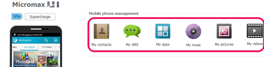 Once your phone is connected with Mobogenie, it will show contacts, SMS, apps, music, pictures, and videos options in My Phone tab. Click on an item to manage it and rest of the other items will be available in left sidebar. See the screenshot below: