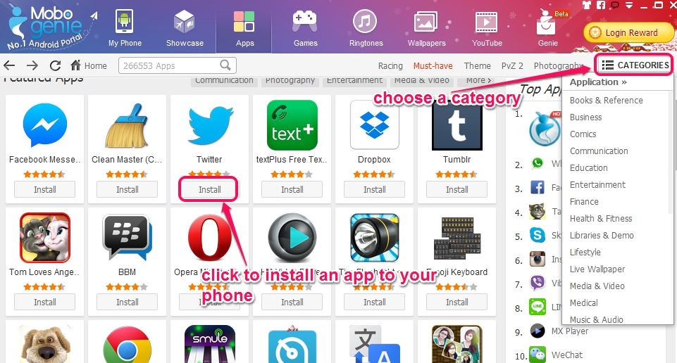 - Search for new apps category wise. Download and install them to your smartphone in just one click.