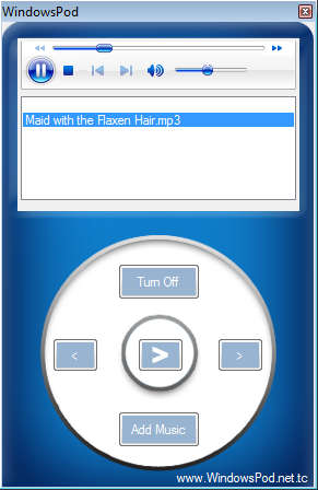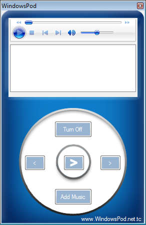 As you can see from the image above, WindowsPod really does look like an iPod. The large round button at the bottom plays the same role in WindowsPod as it does on an actual iPod, for accessing menus and controlling songs which are currently playing. Display at the top contains more advanced player controls and down below at the bottom is where you’ll be able to see the playlist of songs that you import to using the Add Music button. Main features of WindowsPod are: