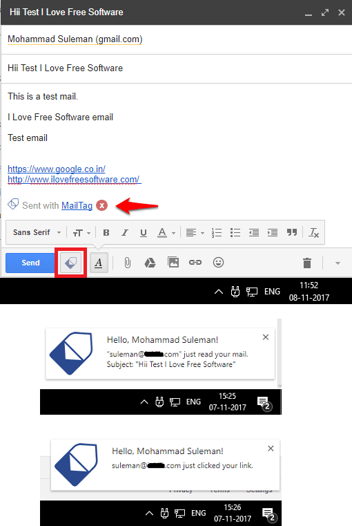 Mailtag is one of the best free email tracking tool for unlimited Gmail tracking. It notifies you when the recipient opens the email or clicks a link in the email message. It throws real-time desktop notifications and also send you an email to notify you these events. In addition to all that, it creates a detailed report and shows that on its dashboard. When you send email while Mailtag is enabled, then in the “Sent” emails, you will see its icon on the emails. And the color of its icon changes if that email was read by the user to whom it was sent.