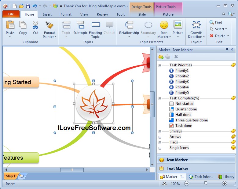 Interface of Mind Maple is very modern looking. At the top you can see the same ribbon menu that Office has. Right sidebar holds options for managing and configuring the mind maps that you create, while on the left drawing area where mind maps are created can be seen. There’s a lot of menus and options, so it might take some time to get familiar with them all. Insert, Format, View, Review, Tools and Style tabs add even more options, but all of them will help you create even more impressive mind maps.