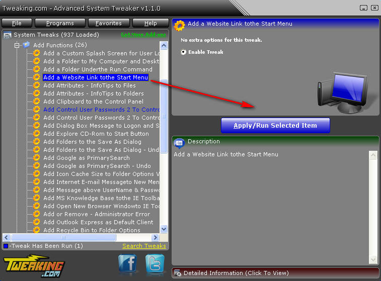 The specific tweak that we’re applying on the screenshot above is an option to add a website link to your Start menu, which is a useful tweak that some have probably wondered how to do. You can even speed up your PC with some of these tweaks, there’s actually a section of options for Speedup tweaks: