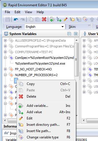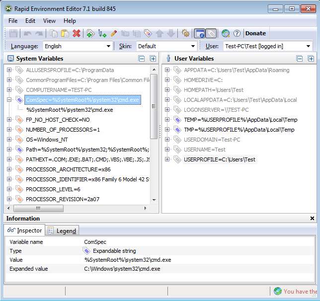Rapid Environment Editor is a free system settings editor which allows you to easily control file paths, various different system variables, like changing directory of TEMP folder, changing the default command prompt application, and dozens more. These settings can be changed for both the entire system, system wide, or you can edit settings of each individual users that exists on the computer.