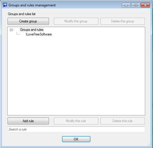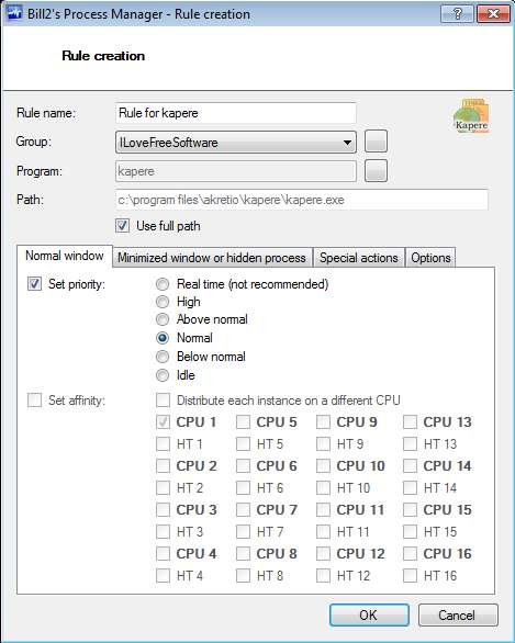 Screenshot above shows us the interface of this free process manager. As you can see it’s pretty simple. Menu options are mainly located down below. In the upper right corner you get a find tool for going through active processes more easily. On the left you can activate all processes to be shown or only the ones which are added to a group that you have open. With the help of groups, Bill2’s Process Manager will allow you to give multiple process different permissions and CPU usage.