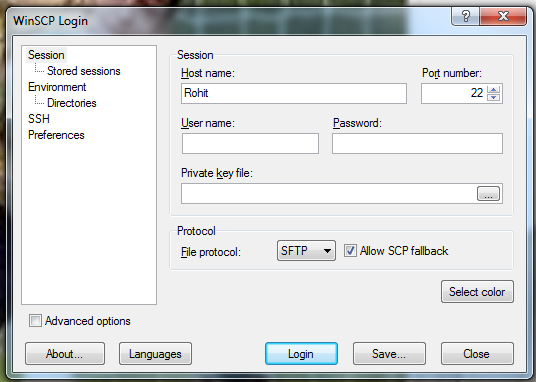There are four tabs in total. All are located on the left hand side of the interface. For a file transfer software, the interface is remarkably simple! The top tab Session, is where the actual data transfer process can be initiated, controlled and terminated. You can select the host name for the session. You will be required to input the Username, Password and the Private Key file for encryption, must be selected too! The option to select the file transfer protocol rests in your hands. Amongst the three options available, you can choose any one. The option for checking your stored sessions is also present.