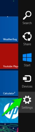 - Now that you have the charm bar up on the screen, click on the settings button in it which is located in the lower part of the charm bar as pointed put in the screenshot above.