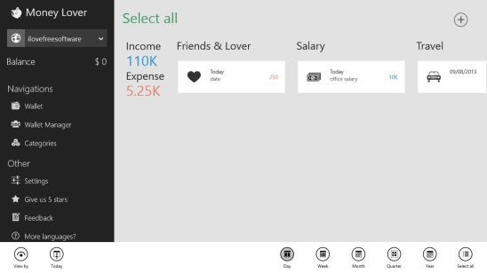 Money Lover Plus, is a free Windows 8 money management app. It is a simple but handy app to keep a record of all your expenses and income. The app consist of different categories for both income and expenses, that you can select and tag the money transaction with. It is one of the simplest way of tracking and planning your personnel finances. As, in the end, its money that matters most to people. So, using this app you can budget and track your spendings, so that you can put a control over the extra spending. Plus it also automatically shows the total amount left with you after spending money in different stuff.