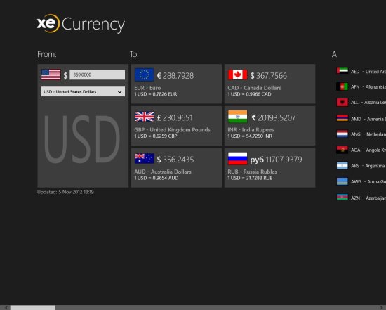 XE Currency is a free Windows 8 currency converter app that enables you to convert one currency to other currencies. It supports a huge list of currencies. The app is simple and straightforward that helps you convert one currency to another in a seamless and easy to use tiles based interface.