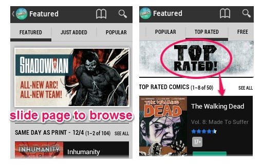 - The main interface of the app shows Featured comics. You can slide the page to check Just Added, Popular, Top rated tabs that will consists of many famous comics, both paid and free.