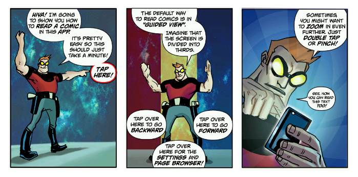 - Reading comics is easy. If you are a first-time user don’t worry. The app will guide you on how to view, zoom, and flip pages through a very short but interesting comic.
