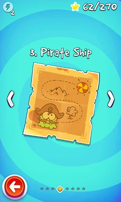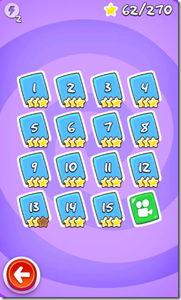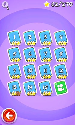 - Each chapter consists of 15 levels and a cute Om Nom video indicated by a green video cam icon. The screenshot below illustrates the level page inside a chapter.