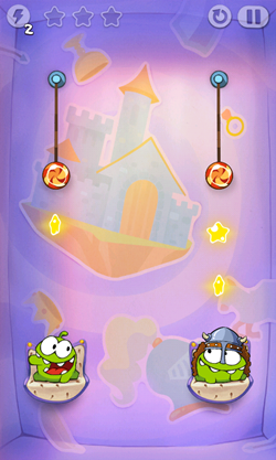 - This game is different from other Cut The Rope series of games because in this game, you have to feed two cute green monsters instead of just one. It might sound complex, but understanding this concept is fairly easy to understand once you start playing this game. The screenshot below shows how there are two candies to feed to the two cute monsters. Also, in the image, you can see the restart level button and the pause button in the top right, and in the left you can see the Star collection indicators and a button with Thunderbolt icon on it. Clicking this button activates the superpower mode, where you can control the candy by touching the screen. The game comes loaded with 3 superpowers. You can always purchase more superpowers (which requires real cash). You can see in the below screenshot that I have already used up one of my superpowers, and am left with just 2 of them now.