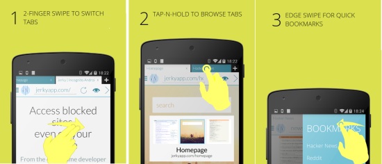 This browser comes with gestures which can be used with one hand. Simply swipe with two fingers to switch tabs, tap on the tabs and hold to browse tabs, and simply swipe from the left edge to quickly access bookmarks. These gestures make the interaction with the browser simple and speedy. It also reminds me of Opera Coast for iOS that works fully with gestures.