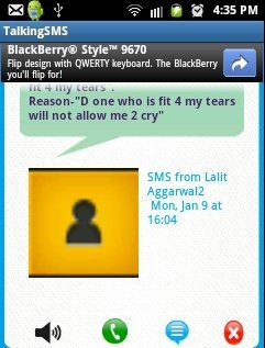 The free Talking SMS app will be installed. Click here to download Talking SMS app from Android Market. Now just make your Android speak the text of your message received on your Android. Make your smart phone smarter with Talking SMS app.