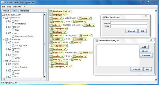 Jaxe is a free XML Editor that lets you edit already written XML documents and create new XML files. It’s a highly configurable XML Editor which supports creating XML Schemas. It validates the text on each insertion and assist you to write error-free XML documents. It’s a multi-platform application that runs on Windows, Unix, and Mac OS X., with a recent Java version. It displays XML data in a tree like structure and allows you to insert elements at different points. It opens every new document with a configuration file and automatically inserts the root node, providing options to add attributes to it.