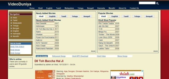 VideoDuniya is also one of the widely used websites to watch Hindi movies online. Apart from Hindi movies this site also offers movies in other regional languages such as Tamil, Bengali, Malayalam, Telugu, etc. VideoDuniya means “a world of video”, and that’s correct it’s a world of videos where you can find variety of videos online. This site allows you to play videos online and that too in HD quality. Main motive of this site is to promote on-line movies that are legally available for free, particularly for the movies that are of interest to the people across the globe, who don’t have access to Indian movie theaters / DVDs.