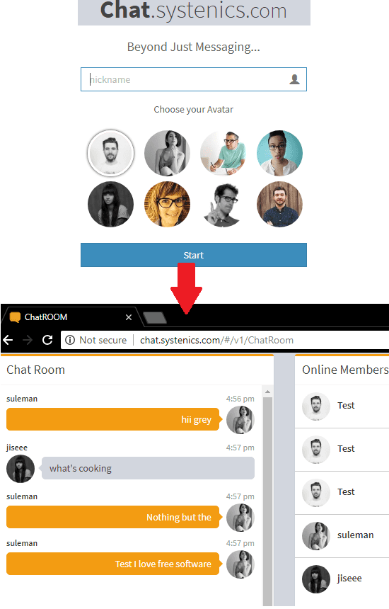 Just like most of the websites in this list, you can easily create chat room on this website. Just use the above link to reach its homepage and then specify the name for the chat room. After that, you can share the link to the room with the people you want. And when all the people have joined the room, you can start the chat. While entering the chat room, a user will have to choose a desired username that will appear in the chat.