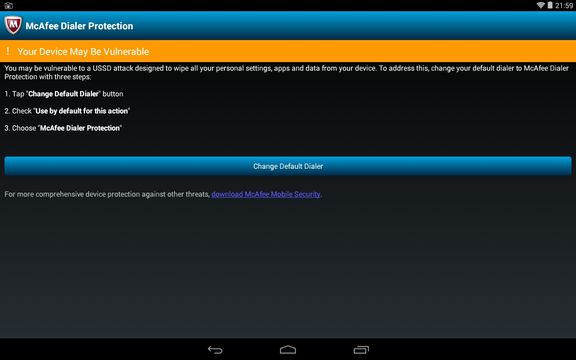 After installing and running McAfee Dialer Protection, you’ll need to select it to be the main dialer app. From that point on every time you try to call a suspicious number or run a dangerous USSD code, you’re going to be warned by McAfee.
