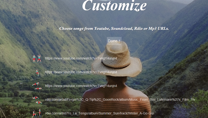 The special feature of this website is that it allows you to play music of your own choice, and that too a different song with every exercise. This can be done by hitting the customize button that appears on the screen before you begin with the workout session. Against every exercise, there is a link for the set song. Replace that link with the link of your own choice and hit done. Songs can be chosen from Rdio, Soundcloud, or Mp3 url’s.