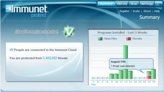 The application is developed to promote cloud based technology to provide you protection from mal ware and threats. The Community-Based Protection allows you to give you protection by using the data contributions given by the users in the community. The collective intelligence will help you to keep your system clean, while this freeware screens your system with all the latest virus detection files stored in Cloud. Easily add people to the Immunet Community and view their protection status online.