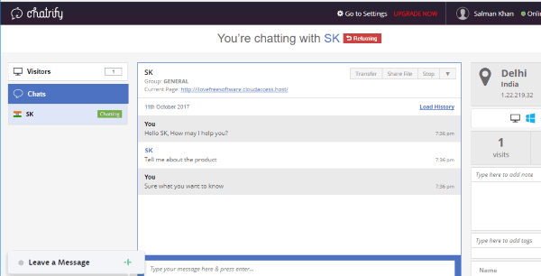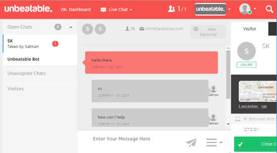 Unbeatable is another free live chat service that can be used to chat with website visitors seamlessly. Similar to Tawk.to, this live chat service also doesn’t have any limitation on chats, users, agents, and more. It is very easy to install on your website, as you can do that by simply copying and pasting the code snippet before the </body> tag. It is a completely cloud-based service and doesn’t have clients for PC, Mac, or mobile phones. This live chat service is perfect for e-commerce websites.