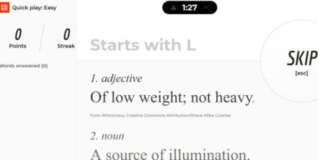 Knoword website has a fun vocabulary game. When you reach its home page you will see a interface like the one shown in the screenshot above. The first page of the game lets you pick the difficulty level you want to start at. The difficulty levels to choose from are easy, medium, and hard. Choose a level and click the start game button. Now press the enter key to begin the game. Remember the game is timed and you have to answer as many questions as you can in one and a half minute. After that game is over and you would be shown your score.