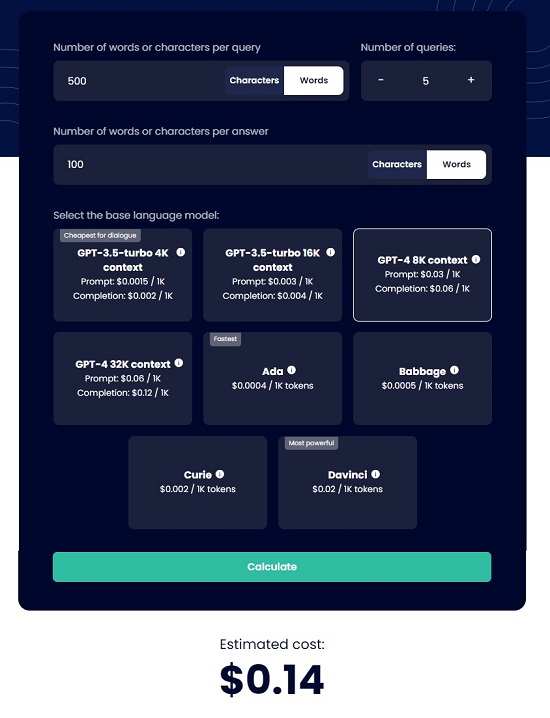 Select the base language model from the drop-down list such as GPT – 3.5 , GPT – 4, Davinci, Ada, Babbage etc., specify the length of the prompt (in terms of words) and the number of words per answer and click on the ‘Calculate Price’ button. The total estimated price will be displayed instantly at the bottom.