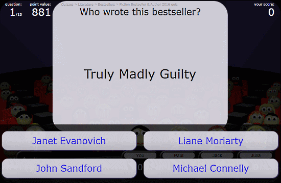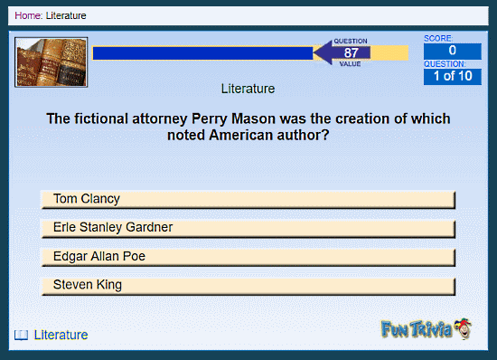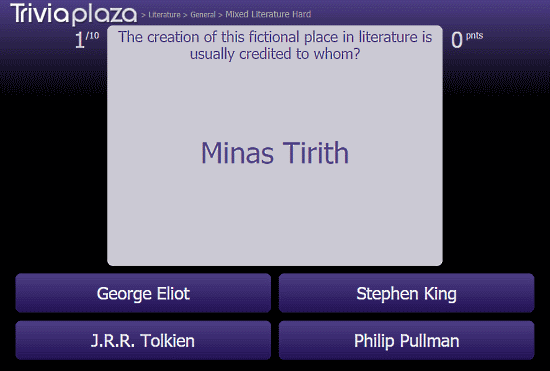 Trivia Plaza is a free trivia website where you can play trivia quizzes online. It covers a wide range of topics like Science, Math, History, Literature, Geography, Computer, Movies, Music and more. The English literature section here features over a hundred quizzes. You can play quizzes based on authors, books, series, genre, years, etc. Each of these quizzes has 10 multiple choice questions. There is no time limit for any of these quizzes. You can play a quiz of your interest and take as much time as you want to finish it. It also has picture quizzes where you have to identify the author from the given picture. When you complete a quiz here, it gives you a score out of 10. The score represents the number of questions you answered correctly in that quiz.