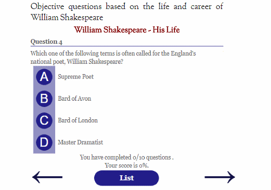 UGC English offers English literature quizzes based on authors. It features quizzes on 6 well known English literature authors; William Shakespeare, Geoffrey Chaucer, John Milton, Christopher Marlow, William Wordsworth, and Edmund Spenser. These quizzes cover these authors livelihood, work, and achievements. There are two quizzes on William Shakespeare and one on each of the rest. Each of these quizzes features 10 questions. These questions are multiple choice. For each question, you can attempt up to four times to get the answer right. The first correct attempt gives you full score for that question whereas, in the later attempts, the score gets lesser and lesser. The score is visible throughout the quiz and you can revisit any question at any time.
