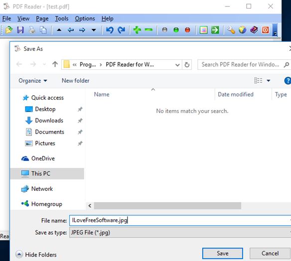 Reader functionality offers everything you’d come to expect from a reader, zoom, rotate, printing, text copying. It also has a slideshow work mode for displaying opened PDFs in a slideshow. Supported output formats include JPG, PNG, BMP, GIF, TIF and also TXT, EPS, WMF and EMF. To start the conversion select “File >> Save as” and select the output format that you want to use. See image above.