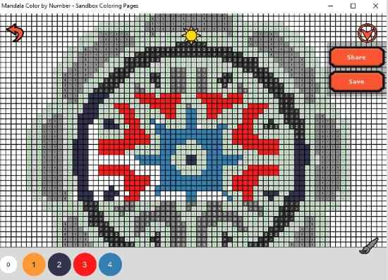This app provides lots of Mandala patterns to be colored. As you can see in the screenshot above, the mandala patterns are also marked by numbers in each cell. A matching color for these numbers is given at the bottom of the page. Choose the color and start filling in all the cells with that number. You can also choose the paint brush icon to color multiple cells at a go. You can choose and color multiple patterns.