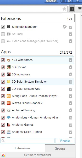 SimpleExtManager is similar to the previously mentioned Extensions Manager, only it has a couple of additional functionalities. One such functionality is extension grouping, which lets you create groups of extensions for easier management.
