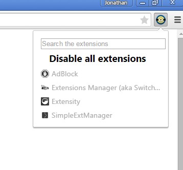 To quickly disable extensions, left click on the top right corner icon and select the “Disable extensions” from the drop down window that pops-out. Like I said, this will disable all the extensions, so to get them back, including One Click Extension Manager, you will need to manually enable them by opening up Chrome settings and selecting Extensions from the left sidebar.