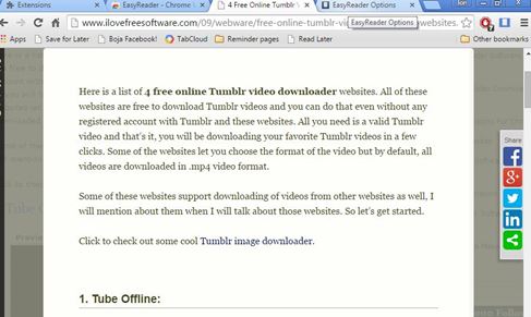 EasyReader’s doesn’t have cloud backup, like Readability does. It’s only functionality is web page cleanup so that it’s easier to read articles on cluttered web pages. There’s a bit more steps to cleanup an articles than there is with Readability, but the end result is pretty much the same.