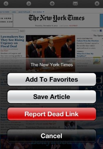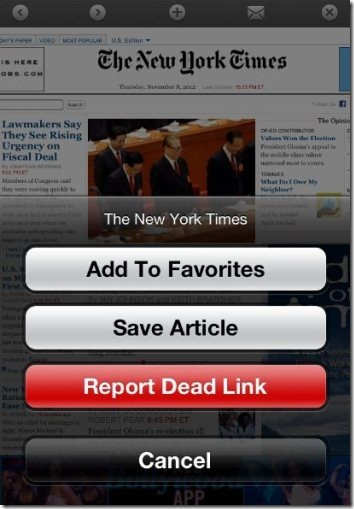 This iPhone Newspapers app includes a next/previous button in order to turn the newspaper page to next or previous. If you are in a hurry and you left off reading some pages of the newspaper, then you can save the newspaper to your favorites or save any particular page or article. On top of this, you can also share the newspaper link via email, Facebook, Twitter, and the like.