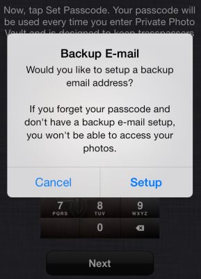 Now after the above screen, the next screen will ask you to select a password or pin to lock up this vault or app. Select any pin that you can remember easily as that will be the only way to access your photos. Once you are done selecting a pin, the app will ask you to setup a backup email address. Just in case you forgot your passcode or pin number, then the backup email can be used. Otherwise you will be locked out of the app, without being able to access your photos. This backup email option though is optional. So it depends if you want to set a backup email or not.