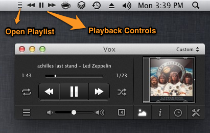 - When Vox is starts up, it shows basic controls in the menu bar so that you don’t have to open up the player to do simple things. The functionality of these menu bar controls are explained in the first screen shot.