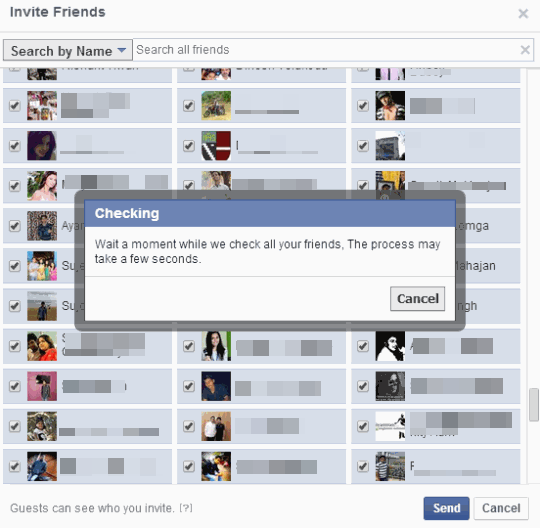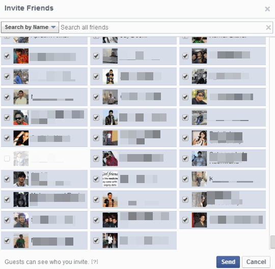 Now you have created a page and would like to invite all your friends to check out that page. The first thing you do is click on the invite button, it lists all the friends you have. Checking all those check boxes is quite boring and tiresome, click on the Facebook Invite All extension, and voila all the checkboxes get checked within a few seconds. As all you friends are being selected, you will get a screen like the one below. Once they are checked click on Send to send your invitation.