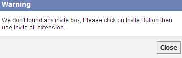 The Add-On can be used only if the invite box is opened in the page. If you click on the tick symbol while you are in your profile page it will give an warning saying that there is no invite button in the page. The warning looks like the one below: