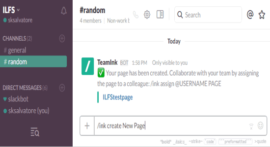 Step 5: After the team member uses the signup option to register for TeamInk, you and the team member will be able to create and assign documents to each other from Slack. To assign a document, you need to type the command /ink assign @username pagename. For example, let’s say you want yto assign the document “my new page” to a team member named Salman Khan, then simply type /ink assign @Salman Khan my new page and then hit Enter.