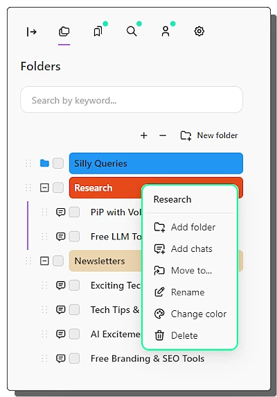 The “Folders” section is where we can create and manage your folders. It has a button at the top to create a new folder. Each folder then has an option to expand and collapse the list of chats organized under it. A right-click on the folder brings a few options to the screen. From there, we can rename folders, delete folders, and move chats to another folder. All folders and chats have a check box in front that allows us to easily select one or multiple items to perform batch operations. At the top, we get a search box that we can use to find a chat by keyword. Clicking any chat in the folders opens that chat on the screen.