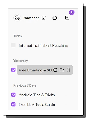 The chat index of ChatGPT also gets a few options with this extension. Hovering the cursor over a chat brings a folder icon along with the archive. We can simply click on that folder icon to add chat to a folder. This brings a list of all folders and we can organize the chat in the desired folder. Each chat has a check box in front. Selecting multiple chats shows a count at the top which also allows us to delete selected chats. This extension also allows us to delete multiple chats which is not possible in ChatGPT.
