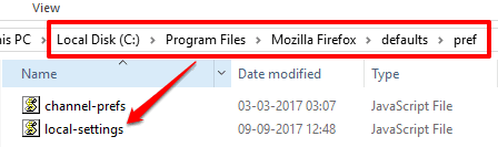 Step 6: Copy local-settings.js file and paste it under “pref” folder of Mozilla Firefox. You can find this folder here: C:\Program Files\Mozilla Firefox\defaults\pref