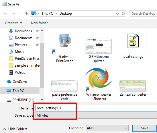 Step 3: Save the file as “local-settings.js“. Remember to select “All Files” option in Save as type location. See the screenshot below.