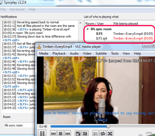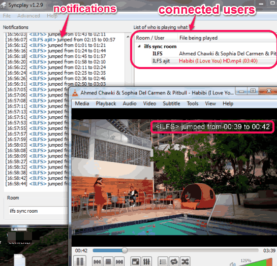 In the above screenshot, you can see the interface of this application, and media file played by me in synchronization. Whenever any connected user jumps to a particular position or play/pause media file, notifications are shown on its interface.