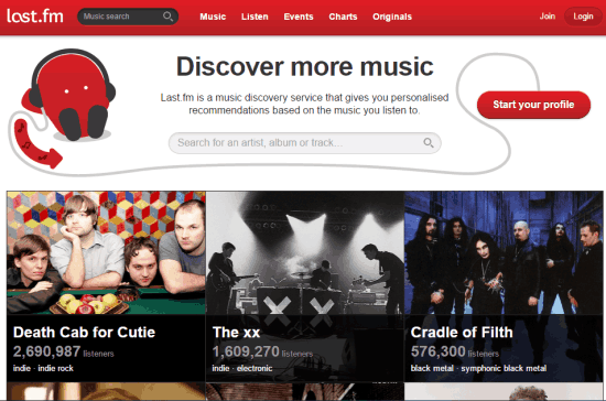 Last.fm is also handy to fulfill your need of finding a good Spotify alternative. You can search music by genre, artist, album, etc. Based on your music selection, it also gives you personalized suggestions. This Spotify alternative also comes with Music Chart feature that lets you explore Top Tracks, Top Artists, Hyped Tracks by country and by tag.