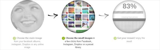 Printmosaic.com is a free online service to create photo mosaics. It lets you create beautiful photo mosaic from your pictures and share them online. It’s an easy-to-use service that can create amazingly pretty photo mosaics in just three steps. Printmosaic.com works by taking pictures from your Facebook, Instagram, or Dropbox accounts, and create photo mosaics that can be shared on various online photo-sharing services free of cost.