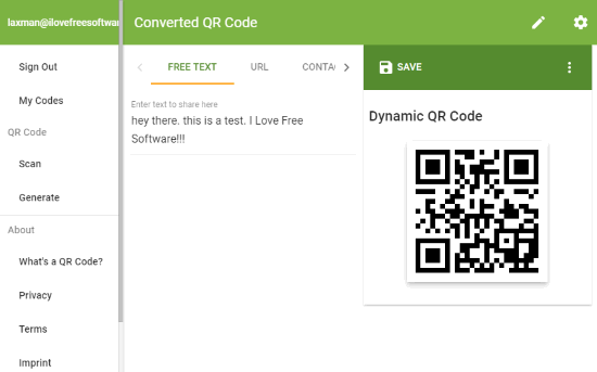 QR Code Generator (Homepage) is one of the best online dynamic QR code generators. I like its very simple interface. It lets you create static QR codes as well. This website doesn’t come with any limitation for creating static and dynamic QR codes. You can create static QR codes without any sign up. To create dynamic QR codes, you need to sign in to your Google account. After that, you can create and store your dynamic QR codes online. Your QR codes can also be saved as SVG, EPS, and PNG image.