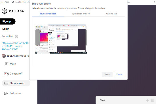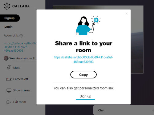 Callaba is a good tool to start a video call anonymously. You can simply make a room and share your room link with your friends or teammates. Once they join the room, you can communicate with them online. This online communication platform lets you share your screen as per your preference. Besides that, you can chat with participants and share attachments. Try this website and host video conference and private call easily and securely.